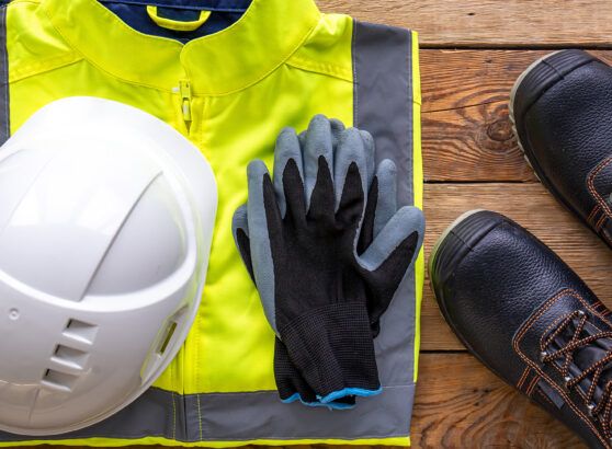 Botas e sapatos de segurança, calçados c/ bico de aço, cintos de segurança, trava-quedas e linhas de vida.